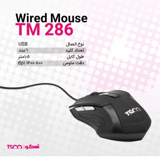 برخی از ماوسها علیرغم کارایی نهچندان پیشرفته و حرفهای، ظاهری خاص و شبیه به ماوسهای ردهبالای مخصوص بازی دارند و از این بابت میتوانند جذابیتهای خاص خود را داشته باشند و ظاهری متفاوت به میز کامپیوتر شما دهند. یکی از همین دست محصولات ماوس مدل TM 286 ساخت شرکت تسکو است که اتصال از نوع باسیم با رابط USB و طول کابل 1.5 متری دارد. این ماوس از نوع اپتیکال با دقت متوسط 1200dpi است. البته این میزان dpi را میتوان بین 1200 و 800 تغییر داد. روی این ماوس 6 کلید تعبیه شده که معمولا در مدلهای حرفهای شاهد این تعداد کلید هستیم. بدنه TM 286 طراحی خاصی با زوایای شکسته دارد و نکته مثبت اینجاست که این طراحی بهصورت قرینه بوده و با هر دو دست میتوان با این ماوس کار کرد. مشکلی که معمولا در ماوسهای با ظاهر متفاوت وجود دارد و معمولا فقط مخصوص راست دستها طراحی میشوند. روی این ماوس با لایهای از پلاستیک ضدتعریق و ضد لغزش پوشانده شده که در استفادههای طولانی مدت باعث آزار کاربر نشود.
