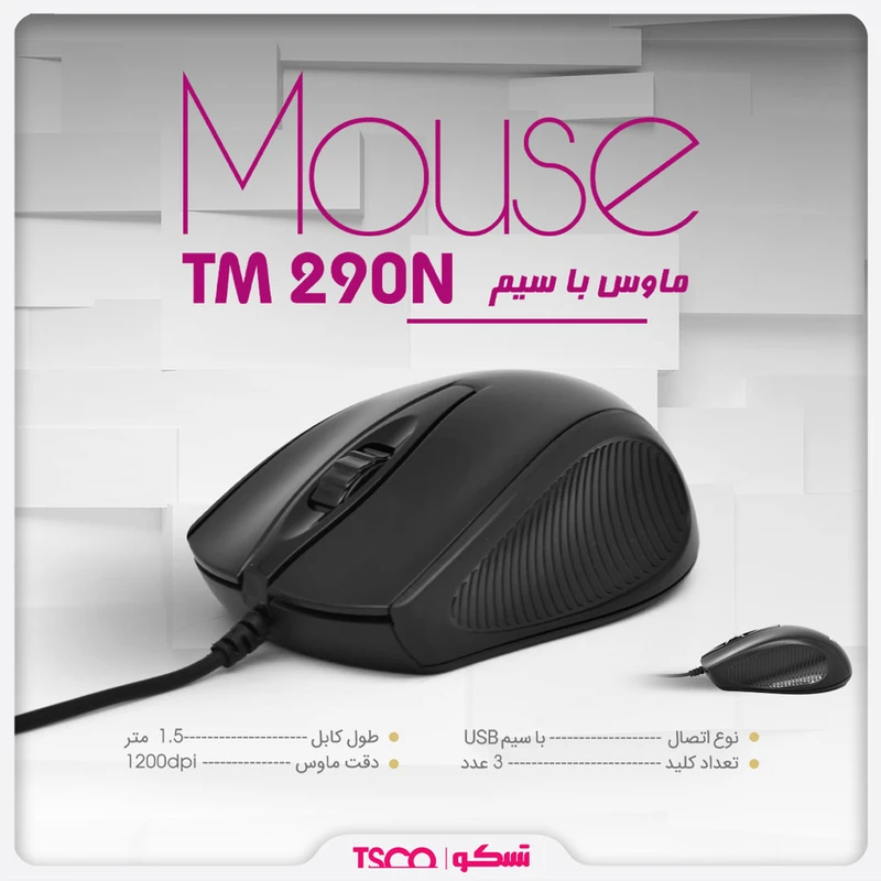 ماوس «TM290N» محصولی از شرکت «تسکو» (Tsco) است که از طریق پورت USB به کامپیوتر متصل میشود. اتصال از طریق USB باعث شده که این ماوس را بهراحتی بتوان به هرکامپیوتری متصل کرد. ماوس TM290N شرکت تسکو دارای سه کلید برای انجام فعالیتهای کامپیوتری است. طراحی این ماوس بهگونهای است که هم کاربران راستدست و هم کاربران چپدست میتوانند از آن بهره ببرند. جنس بدنهی این ماوس از پلاستیک باکیفیت و براق است. نوع حسگر این محصول اپتیکال است و کاربر در استفاده از آن روی اکثر سطوح با مشکلی مواجه نیست. ماوس TM290N شرکت تسکو دارای دقتی برابر با 1200 نقطه بر اینچ است که به یاری آن میتوان اشارهگر ماوس را با دقت بالا در صفحه جابهجا کرد. طول کابل ماوس TM290N برابر با 1.5 متر است. این محصول شرکت تسکو ماوسی مقرونبهصرفه است که با کیفیت ساخت و دقت مناسب برای انجام کارهای روزمره مناسب است.