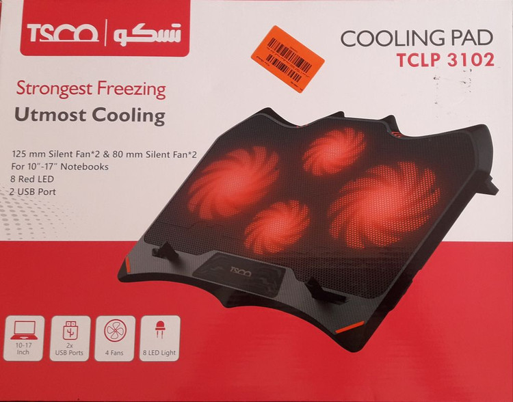 پایه خنک کننده یا کول پد «TCLP 3102» محصولی از شرکت «تسکو» است که میتواند به خوبی میتواند اقدام به کاهش دمای لپتاپ کند. این کول پد به درگاه USB لپ تاپ متصل میشود و دارای دو فن 125 میلیمتری و 2فن 80 میلیتری است. وجود این چهار فن در این کول پد باعث ایجاد جریان هوای خنک و خروج راحتتر هوای گرم لپ تاپ میکند. با توجه به ابعاد TCLP 3102، این کول پد میتواند لپتاپهای تا سایز 17 اینچ را پشتیبانی کند. سرعت چرخش در فنهای TCLP 3102 برابر با 1500 دور بر دقیقه است. شرکت تسکو برای زیبایی بیشتر 8 عدد نشانگر LED روی این کول پد تعبیه کرده است. برای جبران درگاه USB لپ تاپ اشغال شده برای اتصال این کول پد، شرکت تسکو دو پورت USB روی آن قرار داده است. جنس کول پد تسکو مدل TCLP 3102 ترکیبی از فلز و پلاستیک است که این موضوع باعث مقاوم آندر برابر ضربات است. کول پد TCLP 3102 انرژی مورد نیاز خود را از طریق درگاه USB لپ تاپ تامین میکند.