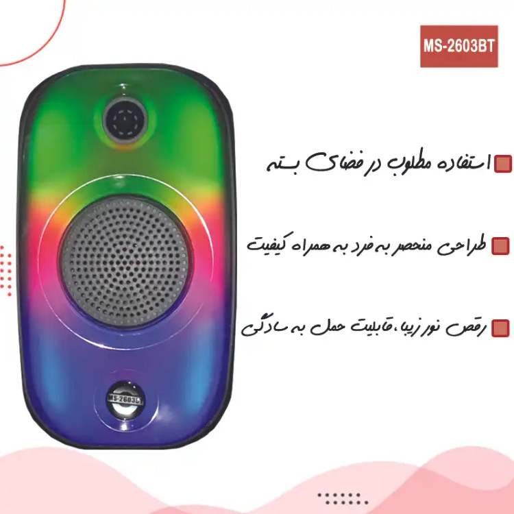 محصولی که ملاحظه می فرمایید یک اسپیکر بلوتوثی قابل حمل بسیار جذاب با قدرت صدای بالاست. این اسپیکر 3 اینچی بر خلاف جثه ی کوچکش صدایی بسیار پرقدرت دارد که در کنار رقص نور جذاب و متغیرش هیجان دوچندانی به گوش دادن موسیقی میدهد. این اسپیکر با 2 ساعت شارژ 1 ساعت و نیم با باطری کار خواهد کرد همچنین شما میتوانید همزان با برق نیز از آن استفاده نمایید.